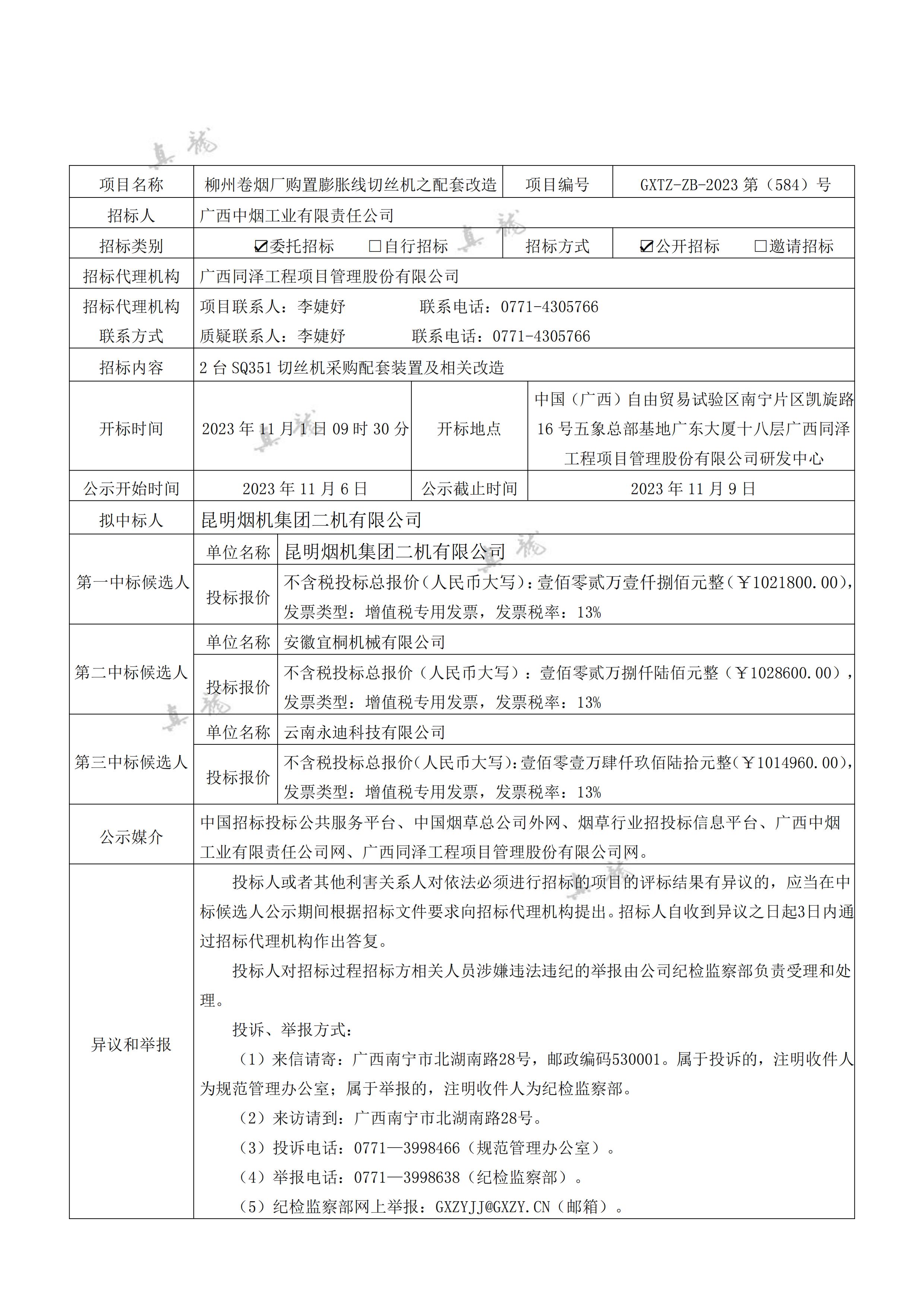 广西中烟工业有限责任公司柳州卷烟厂购置膨胀线切丝机之配套改造(项目编号:GXTZ-ZB-2023第(584)号)中标候选人公示