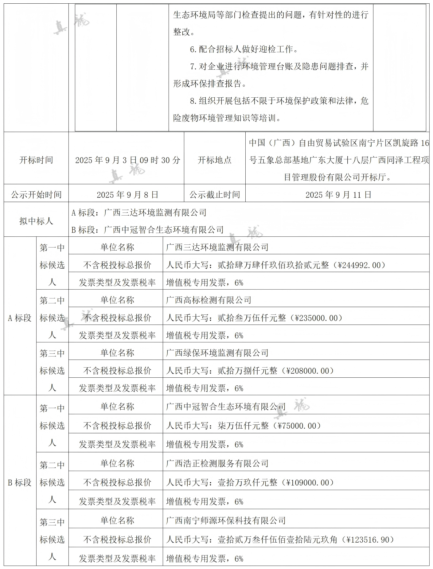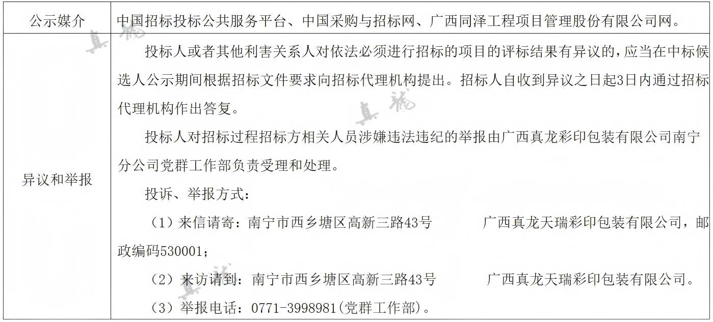 广西真龙彩印包装有限公司南宁分公司2025-2027年度环保技术服务委托合同(项目编号:GXTZ-ZB-2025第(593)号)中标候选人公示