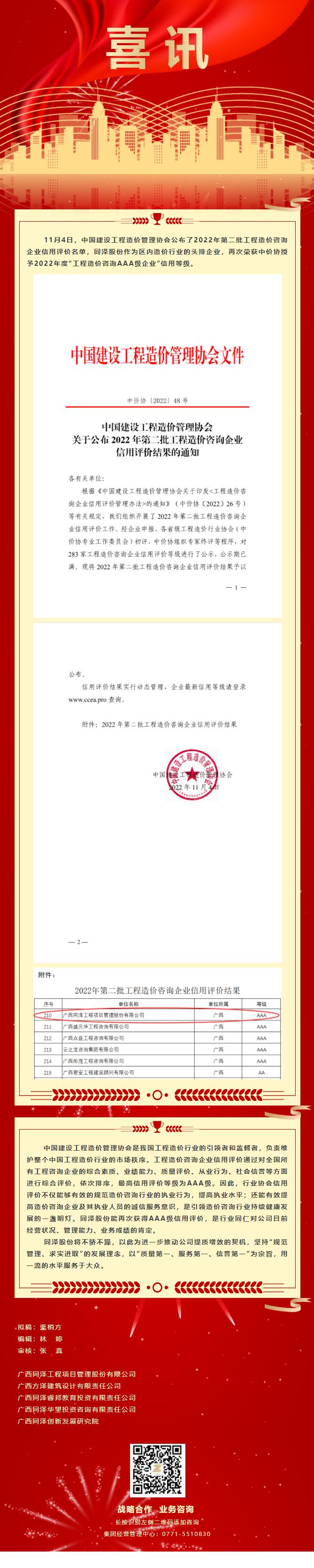 喜讯丨15vip太阳集团荣获中价协授予2022年度“工程造价咨询AAA级企业”信用等级
